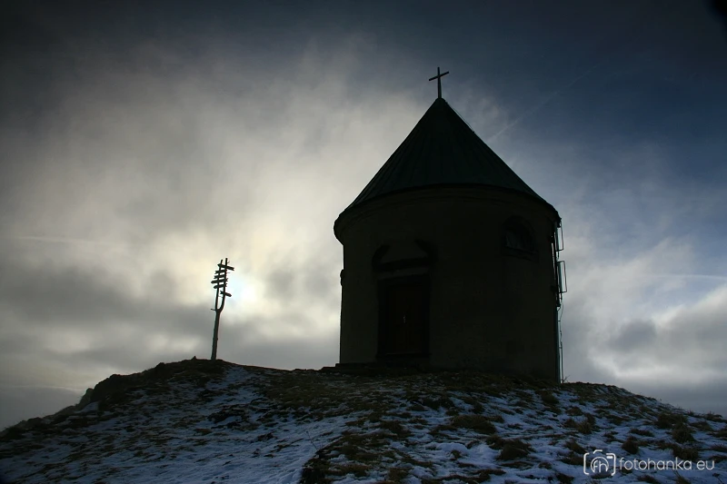 Tmavá dramatická obloha a v kontrastu zářivě bílý sníh. Počasí se stále mění.