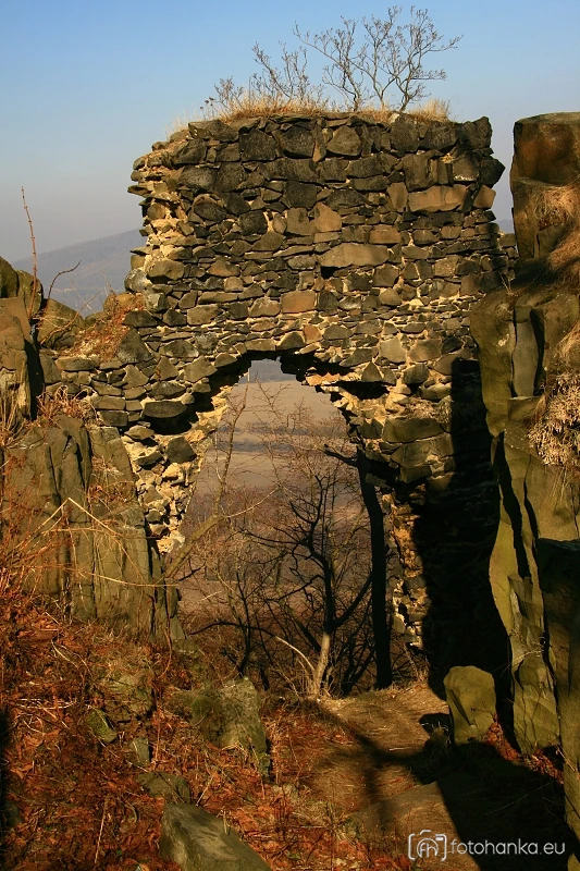 České Středohoří s vyhlídkou na zříceninu hradu Oltářík. V pozadí napravo Hazmburk, nalevo na kopci vykukuje Košťálov.
