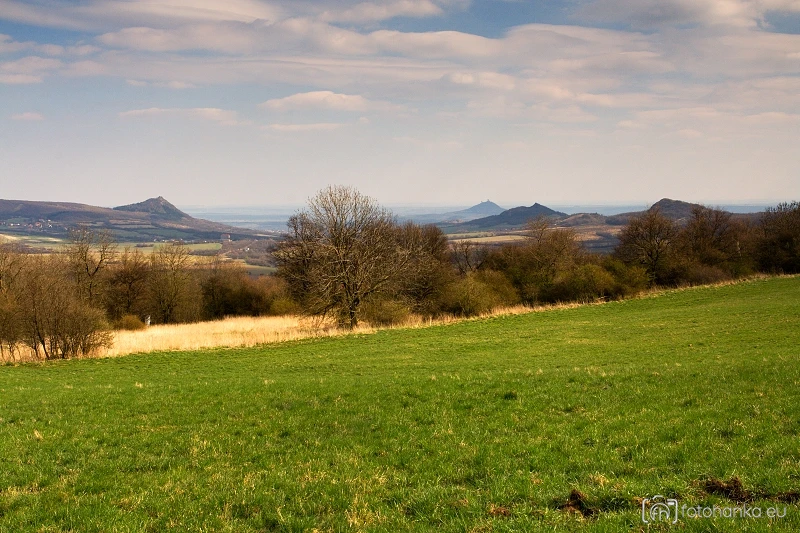 Pohledy na kopečky Středohoří přes louku při cestě ke Kalvárii nad Portou Bohemica.