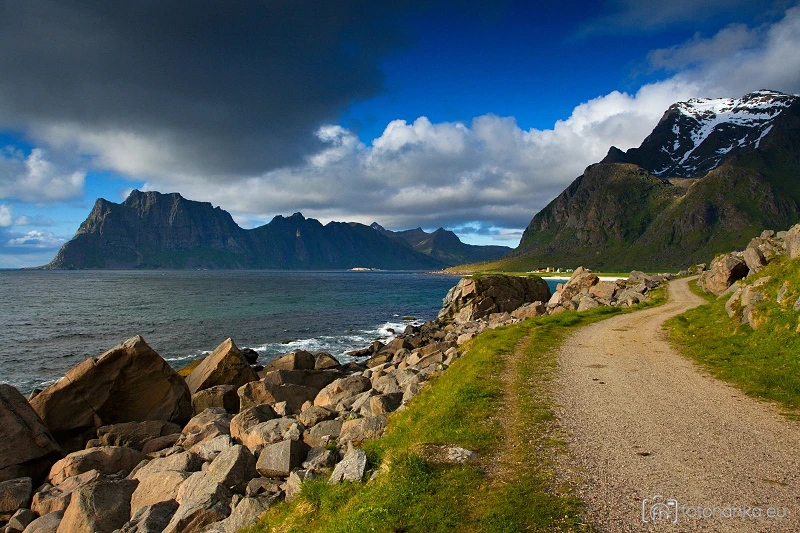 Lofoty, Norsko. Pohledy z bývalé silnice z Haukland beach do Uttakleiv.