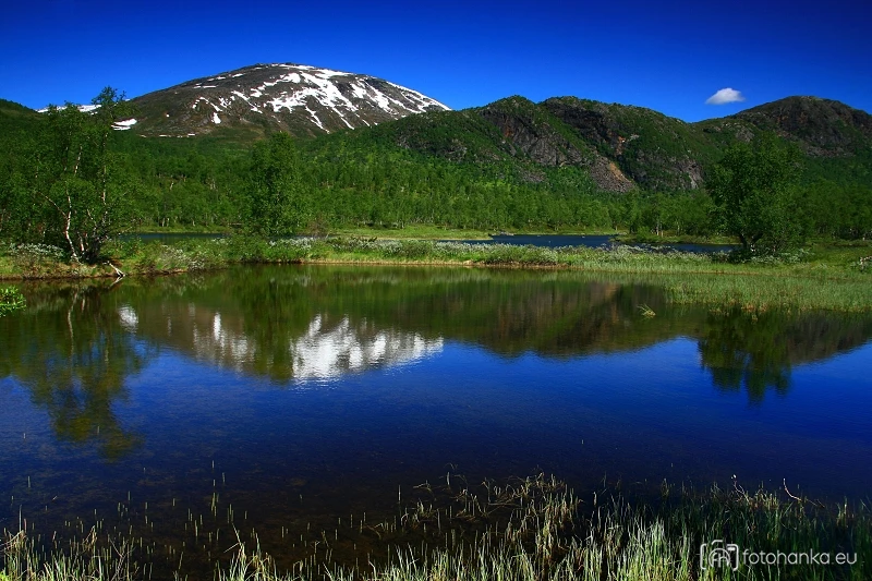 Švédské jezero, příjemné zastavení při silnici vedoucí přes Hede do Norska. Pohled přes jezero k pohoří NP Sanfjallet.