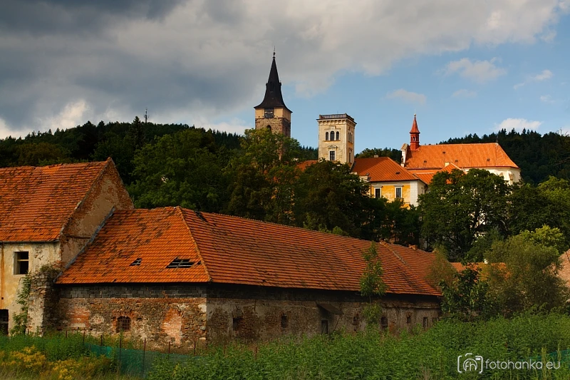 Pohled na historickou část města. Věž nalevo patří bývalému klášternímu kostelu sv. Václava, vpravo je kostel sv. Michaela Archanděla.