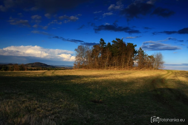 České Středohoří s vyhlídkou na zříceninu hradu Oltářík. V pozadí napravo Hazmburk, nalevo na kopci vykukuje Košťálov.